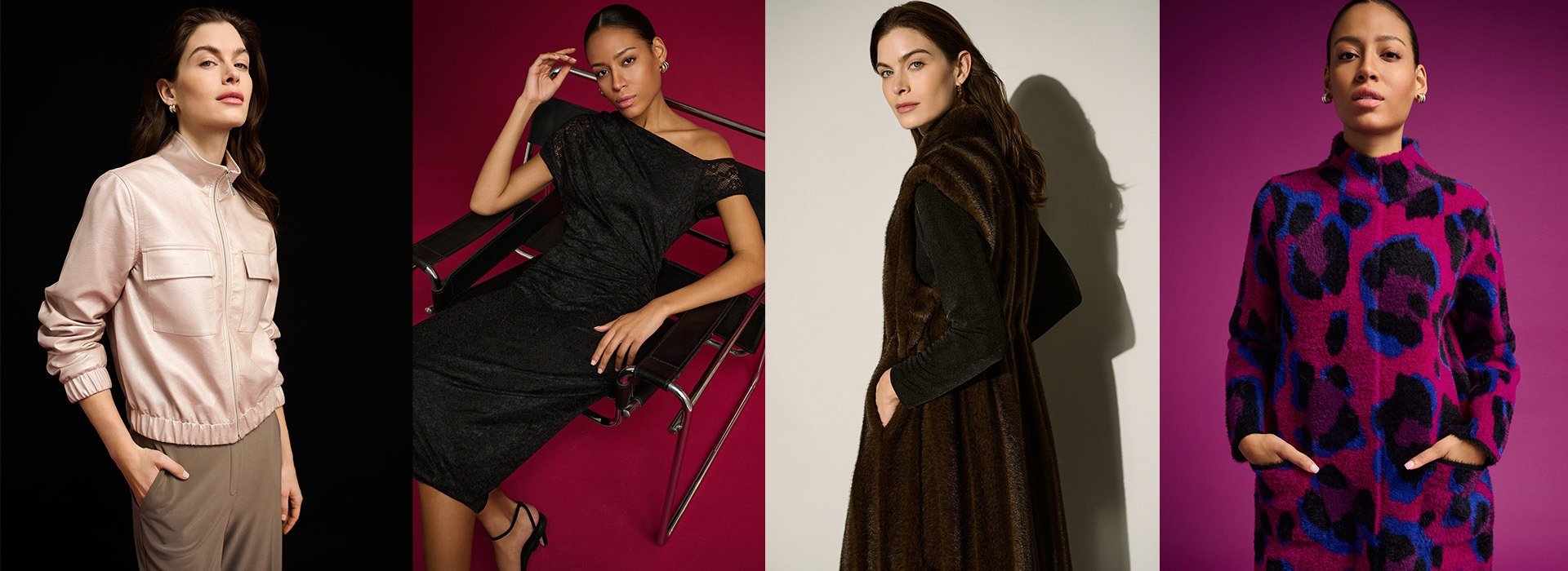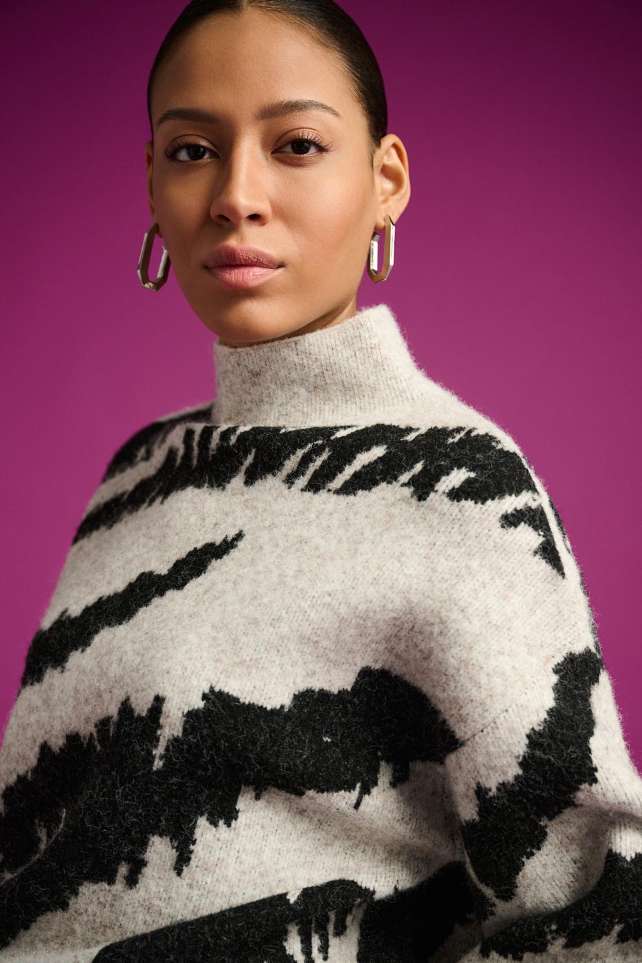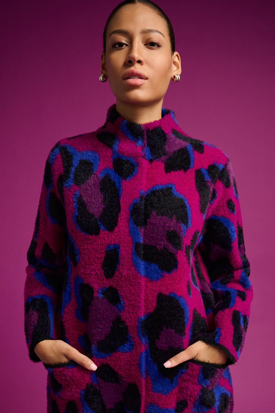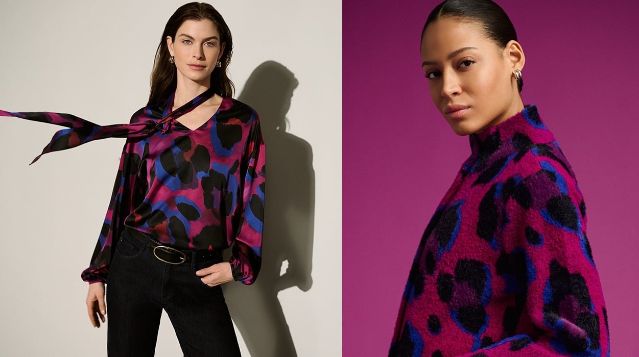Dynamisant la saison avec des contrastes captivants en noir et blanc et des couleurs audacieuses, Free insuffle un élan nouveau aux tenues d'hiver. Le Magenta riche illumine les imprimés animaux des manteaux en tricot et des articles en satin brillant, tandis que des touches fantaisie, des franges ondulantes au Lurex chatoyant, donnent une finition stylée à chaque vêtement.