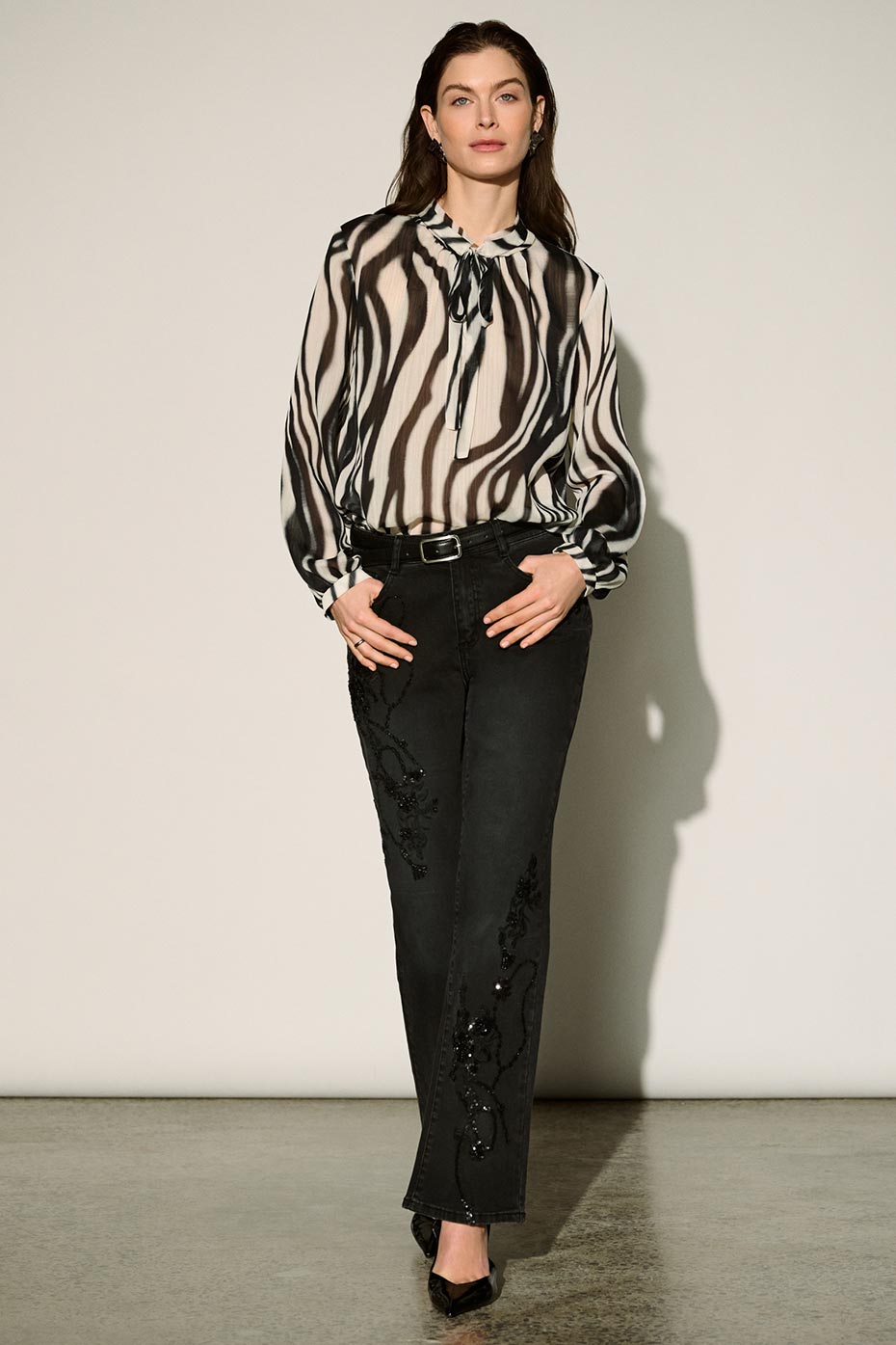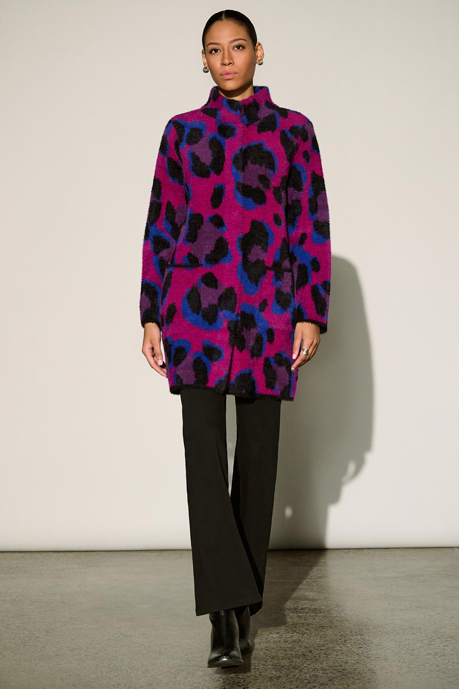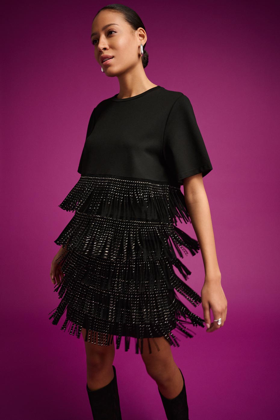 Dynamisant la saison avec des contrastes captivants en noir et blanc et des couleurs audacieuses, Free insuffle un élan nouveau aux tenues d'hiver. Le Magenta riche illumine les imprimés animaux des manteaux en tricot et des articles en satin brillant, tandis que des touches fantaisie, des franges ondulantes au Lurex chatoyant, donnent une finition stylée à chaque vêtement.